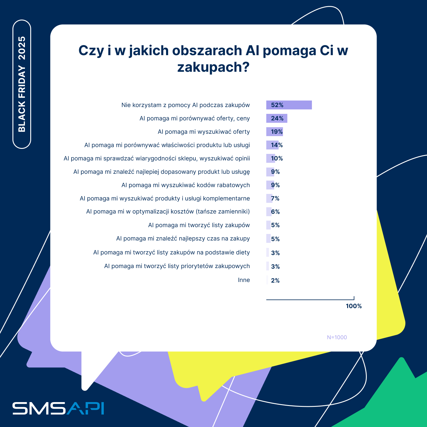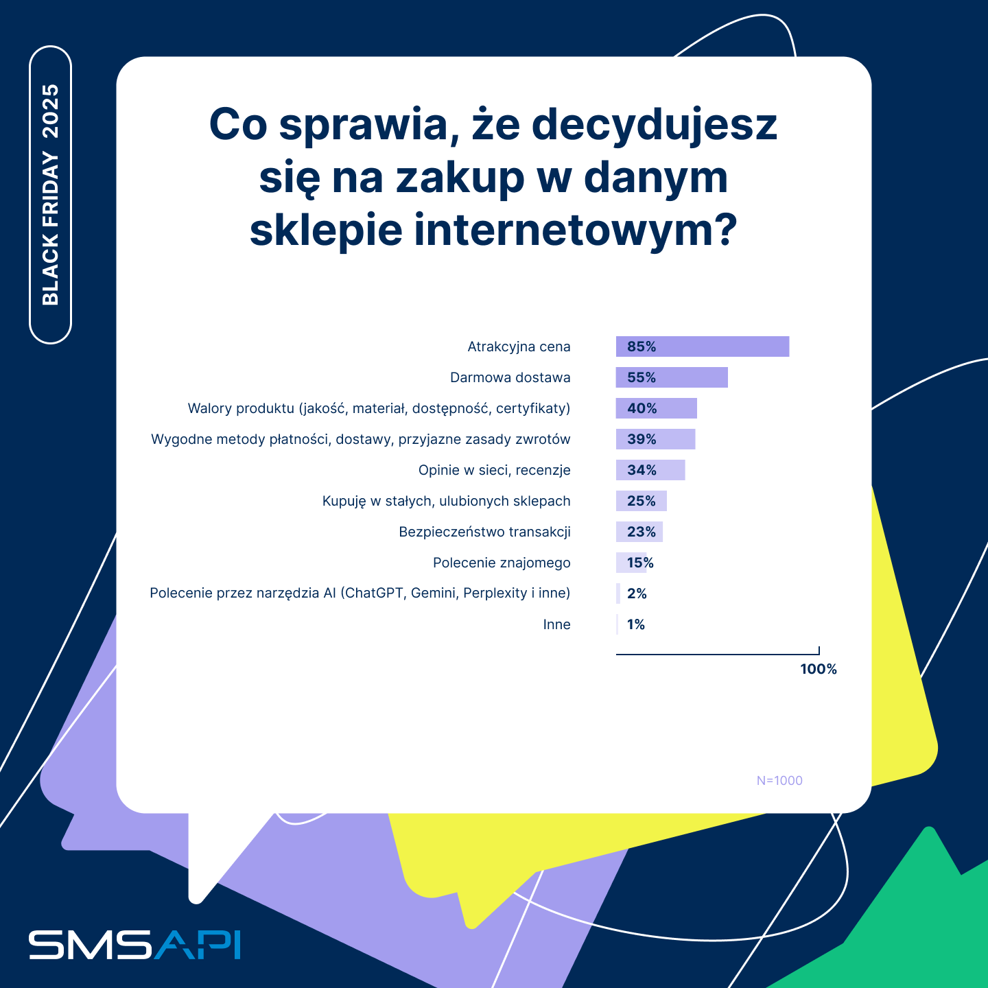 Badanie ankietowe “Zainteresowanie promocjami na Black Friday 2025” zrealizowała metodą internetową dla SMSAPI firma BioStat na grupie 1000 respondentów. Raport z jego wynikami dostępny jest na stronie www.smsapi.pl.