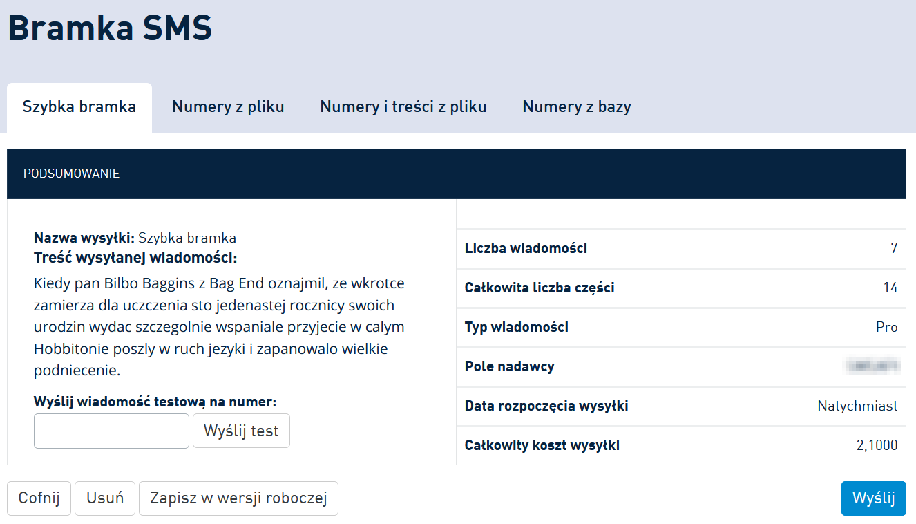 Zwróć uwagę, że pod polem treści w bramce SMS znajdziesz informacje na temat wykorzystanych znaków oraz liczby SMS do wysłania. Przed zleceniem wiadomości do kilku odbiorców sprawdź również ekran podsumowania.